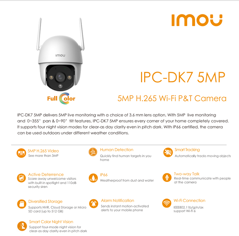 Kết luận, Camera IMOU DK7 5MP là một sự lựa chọn xuất sắc cho những ai đang tìm kiếm một giải pháp an ninh đáng tin cậy, linh hoạt và dễ sử dụng. Với những tính năng ấn tượng và thiết kế thân thiện, đây chắc chắn là một đầu tư đáng giá cho sự an toàn của gia đình bạn.