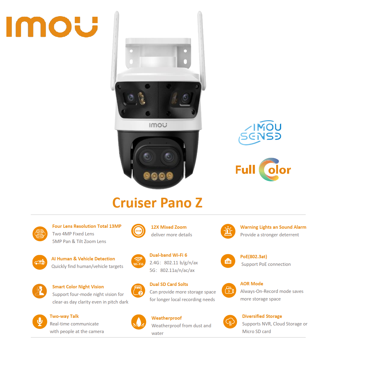 Camera IMOU Cruiser Pano Z là dòng camera ngoài trời cao cấp với 4 ống kính độc lập (kết hợp ống kính cố định và quay quét), cho phép zoom xa 12X (lên tới 60m), độ phân giải 5MP-3K, hỗ trợ Wi-Fi 6 băng tần kép và 2 khe cắm thẻ nhớ tối đa 1TB. Đây là giải pháp giám sát diện rộng không điểm mù, tích hợp AI